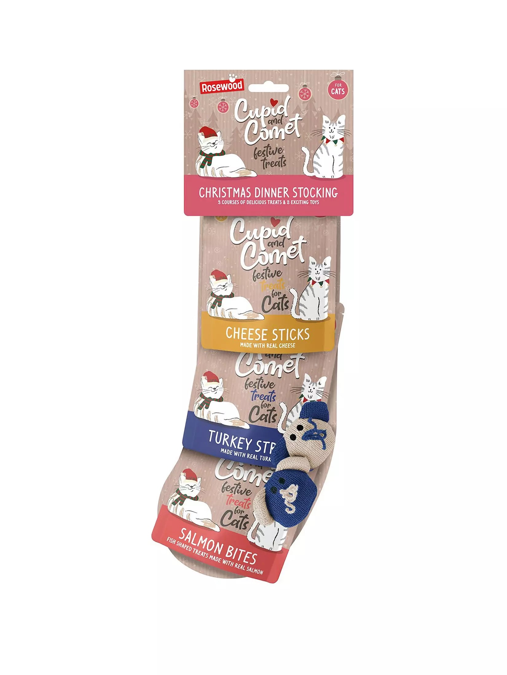 This Christmas Dinner Stocking for Cats features 3 courses of delicious treats and 2 exciting toys. Including 1 x 40g pack of Salmon bites for starters, 1 x 40g pack of Turkey strips for main course and 1 x 40g pack of cheese sticks for dessert; as well two catnip mice.